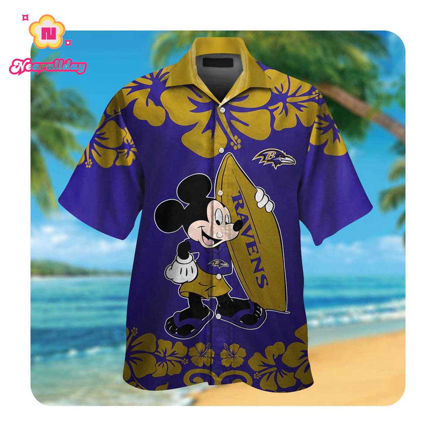 Get ready to show off your team spirit with the Baltimore Ravens and Mickey Mouse Hawaii Shirt! This summer button-up shirt is perfect for both men and women, featuring a unique design that combines your love for the Ravens and Disney. Made from high-quality materials, this shirt is not only stylish but also comfortable to wear. Stand out from the crowd and support your favorite team in style with this one-of-a-kind shirt!