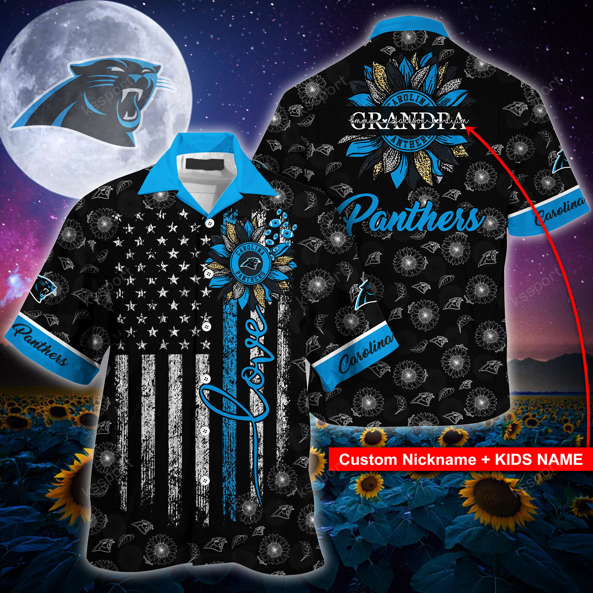 Get ready to show off your Carolina Panthers pride with this custom NFL Hawaii shirt featuring a sunflower design. Personalize it with your nickname or your kids’ names for a unique touch. The perfect gift for Mother’s Day or Father’s Day!