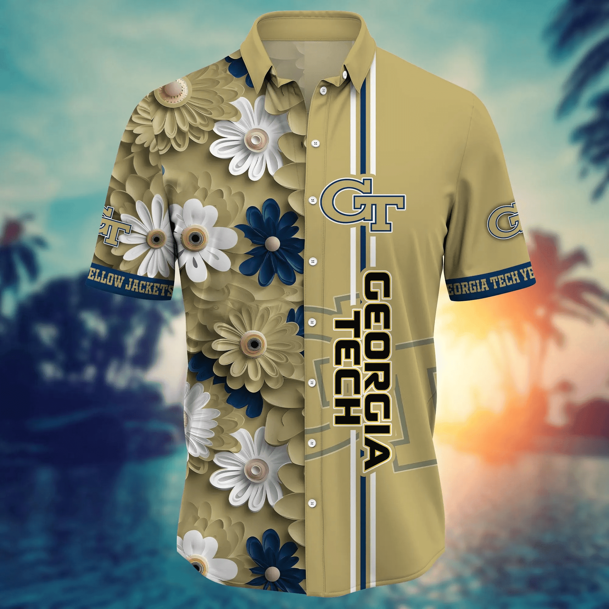 Georgia Tech Yellow Jackets Flower 3D Button Hawaii Shirt Gift for Men Dad Father And T Shirt For Fans, Summer Football Shirts NA49574