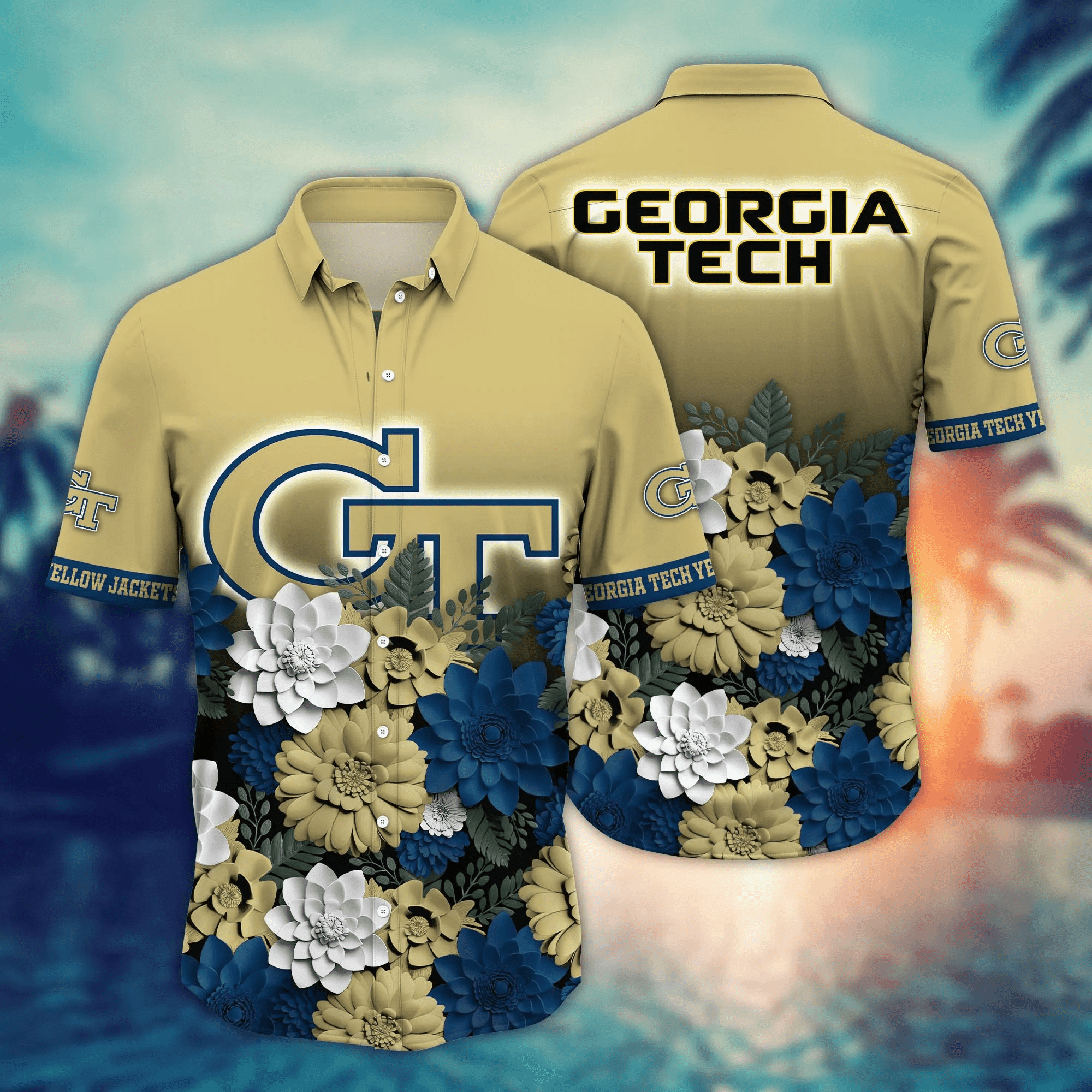 Georgia Tech Yellow Jackets Flower 3D Button Hawaii Shirt Gift for Men Dad Father And T Shirt For Fans, Summer Football Shirts