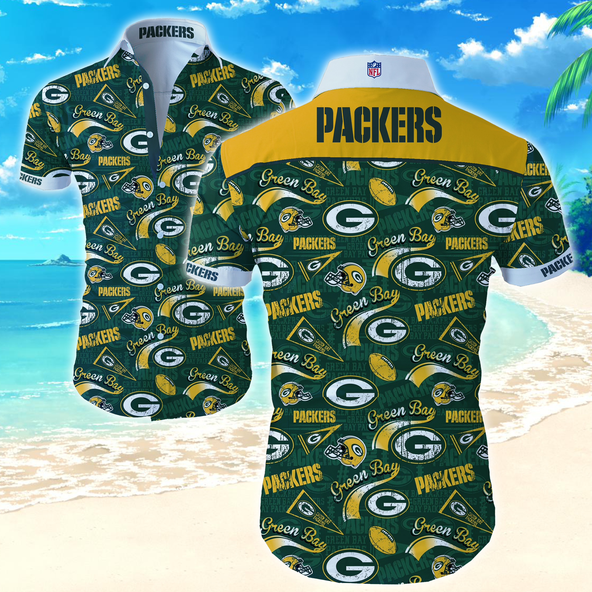 Welcome to the ultimate fan gear for Green Bay Packers supporters! Our Hawaiian shirts feature the iconic repeat logo, offering style, comfort, and team spirit. Stand out at game day parties or casual outings with this unique and trendy apparel. Show your love for the Packers in a fun and fashionable way!