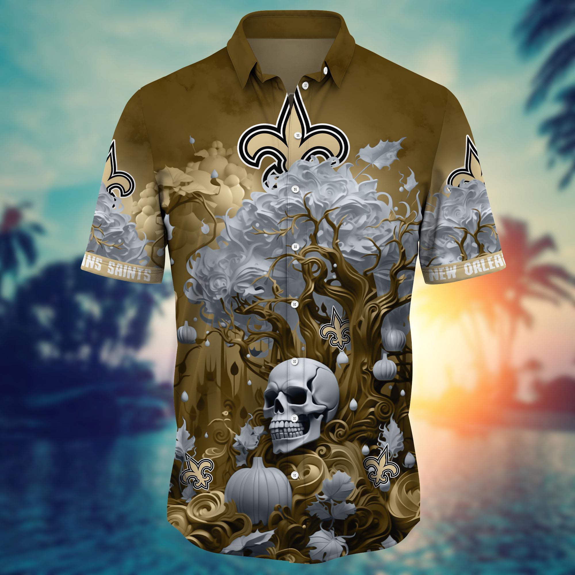 Welcome to the ultimate fan gear for the New Orleans Saints! This trendy Hawaii shirt featuring a skull design is a must-have for any die-hard Saints supporter. Made with high-quality materials, this shirt offers both style and comfort. Stand out from the crowd and show your team spirit with this unique and eye-catching shirt. Perfect for game days, tailgating, or just everyday wear. Get yours now and be the envy of all your friends!