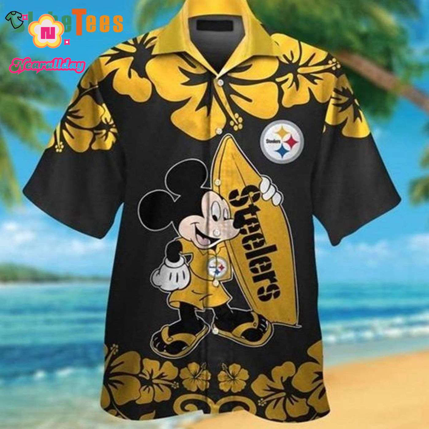 About NFL Pittsburgh Steelers Logo Mickey Holding A Surfboard Steelers Hawaiian Shirt Perfect Gifts For Your Loved Ones information: